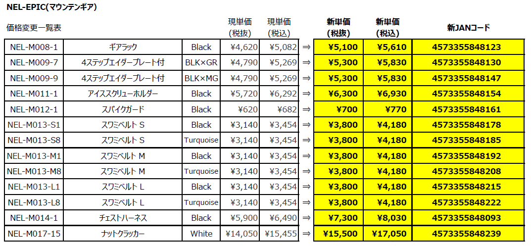 令和8年3月1日(日)よりNEL-EPIC マウンテンギア製品の一部価格改定を行います。
